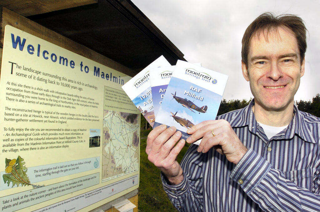 Our MD, Clive Waddington, set up the free access Maelmin Heritage Trail with co-founder Peter Forrester, formally opening 26 years ago in 2000. It’s located in Milfield, the site of a major Anglo-Saxon palace identified through aerial photography. According to the historian Bede, Maelmin was the successor royal Northumbrian palace to the one at Ad Gefrin, and both feature in his account of the development of the great early medieval kingdom of Northumbria.